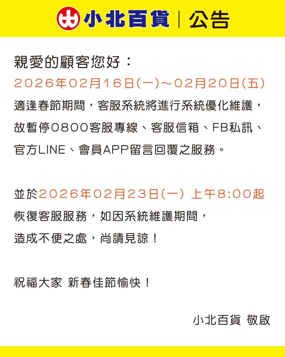 春節期間客服暫停服務公告